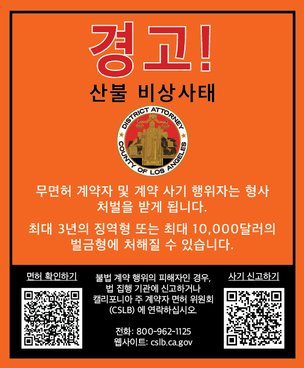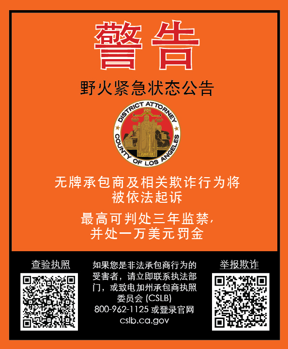 The Office is distributing warning signs in English, Spanish, Chinese, Korean and Armenian throughout the affected neighborhoods. The signs include a QR code with a link for victims to report unlicensed contractors.