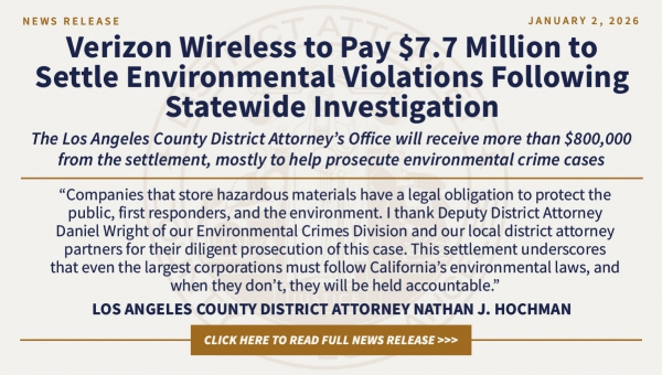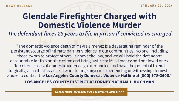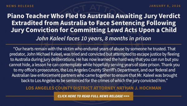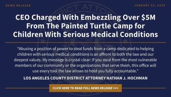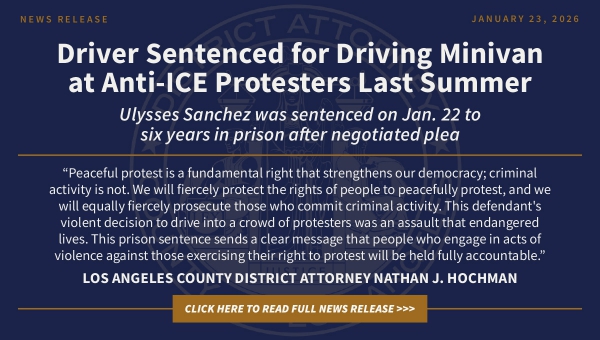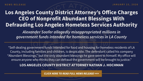 One year after taking office and restoring prosecutorial discretion and criminal accountability, Los Angeles County District Attorney Nathan J. Hochman is marking his first 365 days with an increase in public safety efforts, major takedowns of organized crime and burglary crews, busting the largest illegal cannabis operation in Los Angeles County history, aggressive prosecution of human traffickers, exonerating factually innocent convicted individuals, and filing thousands of Proposition 36 charges against repeat retail thieves. Those are just a few of the initiatives Hochman has successfully spearheaded since taking his oath of office last Dec. 3.Read more...