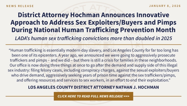 “Human trafficking is essentially modern-day slavery, and Los Angeles County for far too long has been one of its epicenters,” said District Attorney Hochman. “A year ago, we announced we were going to aggressively prosecute traffickers and pimps – and we did – but there is still a crisis for families in these neighborhoods. Our office is now doing three things at once to go after the demand and supply side of this illegal sex industry: filing felony cases, including conspiracy charges, against the sexual exploiters/buyers who drive demand, aggressively seeking years of prison time against the sex traffickers/pimps, and offering resources and services to sex workers, in an effort to end their exploitation.”Read more...