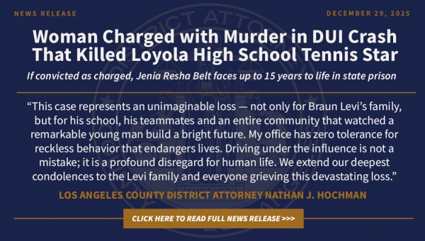 Los Angeles County District Attorney Nathan J. Hochman was joined by Jennifer Levi, the mother of 18-year-old Braun Levi, who was killed in a pedestrian-involved collision earlier this year. Levi will speak about the charges filed in the death of her son. Additional speakers include Los Angeles City Councilmember Traci Park and California State Senator Bob Archuleta.Read more...