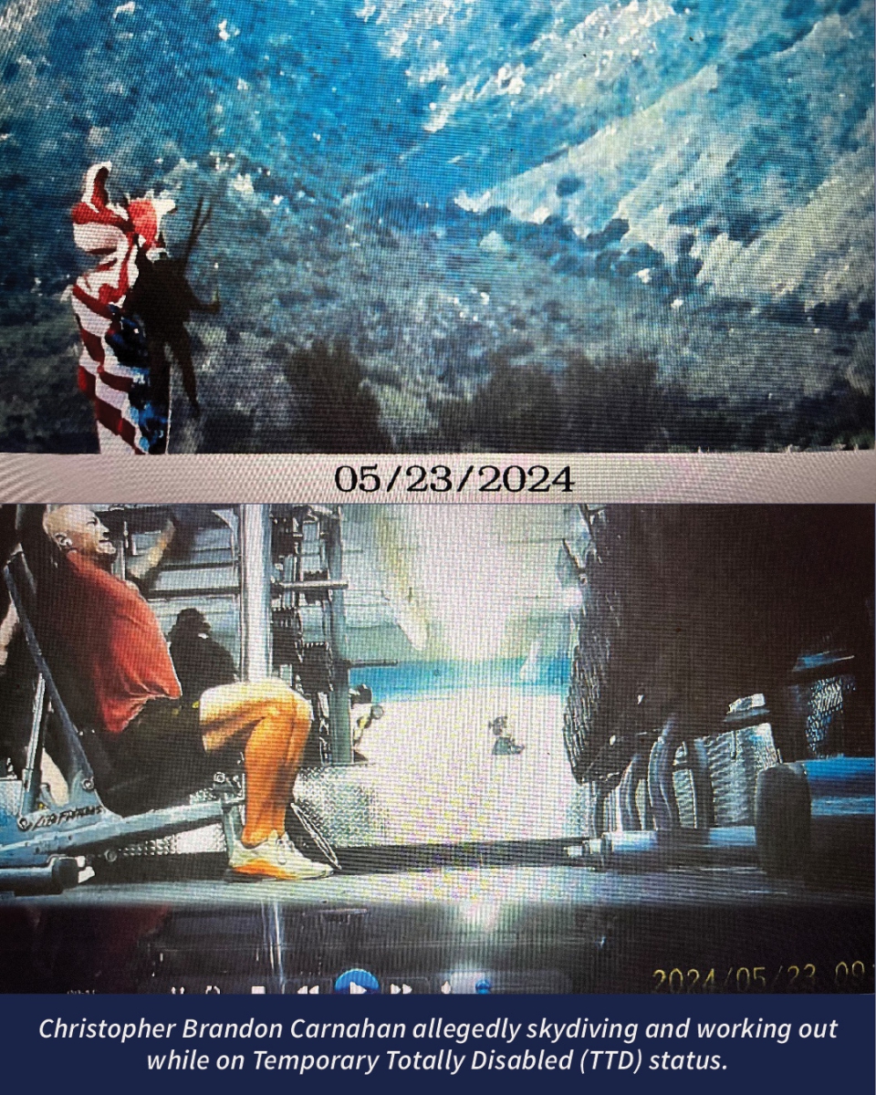 On May 22, 2023, Officer Carnahan purportedly injured his left elbow while on duty and was subsequently placed on Temporary Totally Disabled (TTD) status. Prosecutors allege that while on TTD status, Carnahan completed many skydives at Skydive Elsinore in Lake Elsinore, California and worked out at a fitness center, contrary to his claims of being temporarily totally disabled.